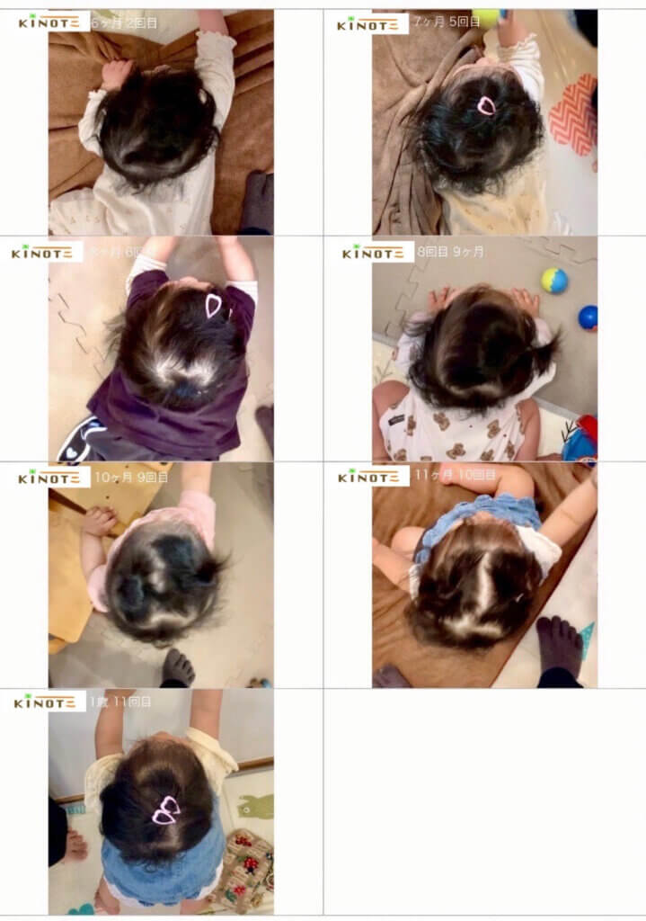 10回目あたりまでとても順調でしたが、11ヶ月に入ったあたりから長い間風邪や発熱などの体調不良が続き、寝ていることも多かったため、1歳1ケ月までの間に頭の形に左右差が表れてきました。