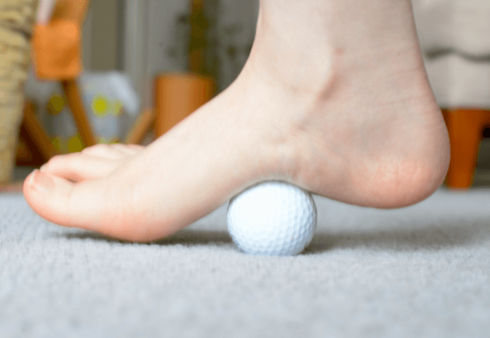 足裏の筋肉や筋膜が硬くなると、外反母趾の痛みや歩きにくさが悪化します。テニスボールやゴルフボールを床に置き、その上に足裏を乗せてコロコロ転がしましょう。足裏の血行がよくなり、筋肉の緊張がほぐれます。サランラップの芯を使って転がすのもおすすめです。