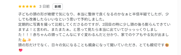 子どもの頭の形が絶壁で気になり、本当に整体で良くなるのかなぁと半信半疑でしたが、少しでも改善したらいいなという思いで予約しました。